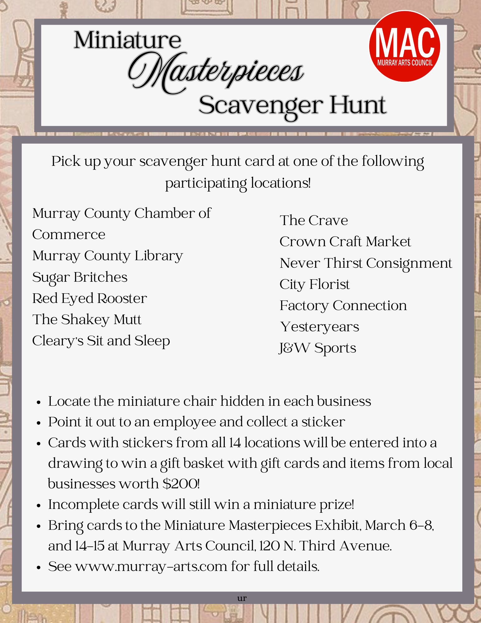 To celebrate Murray Arts Council’s upcoming Miniature Masterpieces Exhibit in March, we are excited to announce a Scavenger Hunt through some of our local businesses! A miniature chair in a plastic case has been hidden within each participating business. Find the chair (please do not take it), let an employee know where you found it, and receive a sticker on your postcard. If you collect all 13 stickers you will be eligible to win a gift basket worth approximately $200 with prizes and gift cards to local businesses.