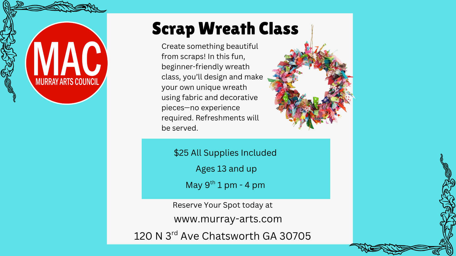 Scrap Wreath Class Saturday, May 9, 2026 1:00 PM 4:00 PM Murray Arts Council 120 North 3rd Avenue Chatsworth, GA, 30705 United States (map) Google Calendar ICS